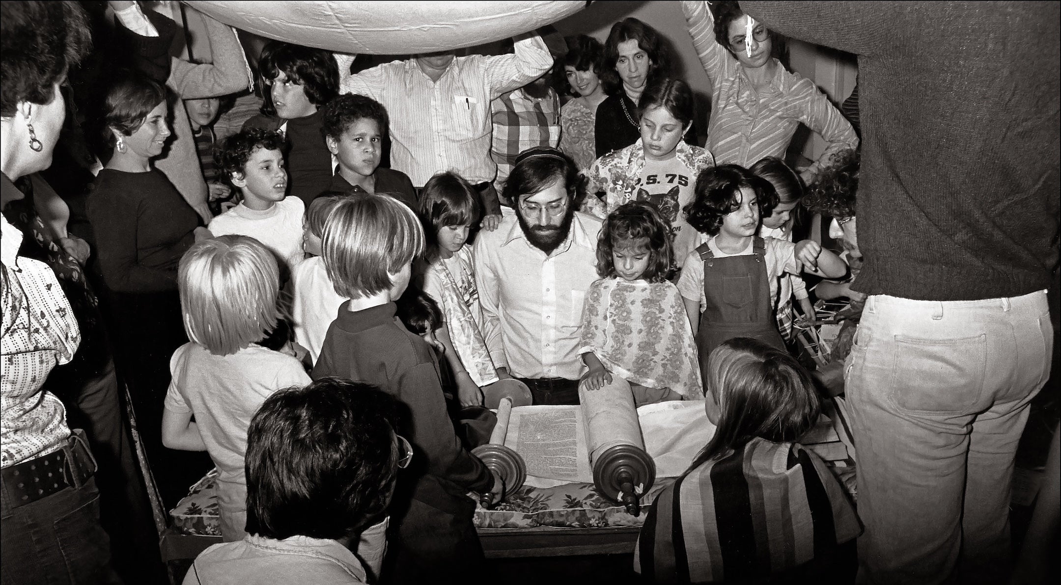 In the second, taken at the New York Havurah Shabbat School on the Upper West Side a year later, children in T-shirts and overalls surround a young Jay Greenspan as he reads from the Torah. Greenspan, who died in 2017 at age 69, led a revival of traditional Jewish scribal arts in the havurah movement and beyond, closing the gap between Jewish worlds that had begun to drift apart.