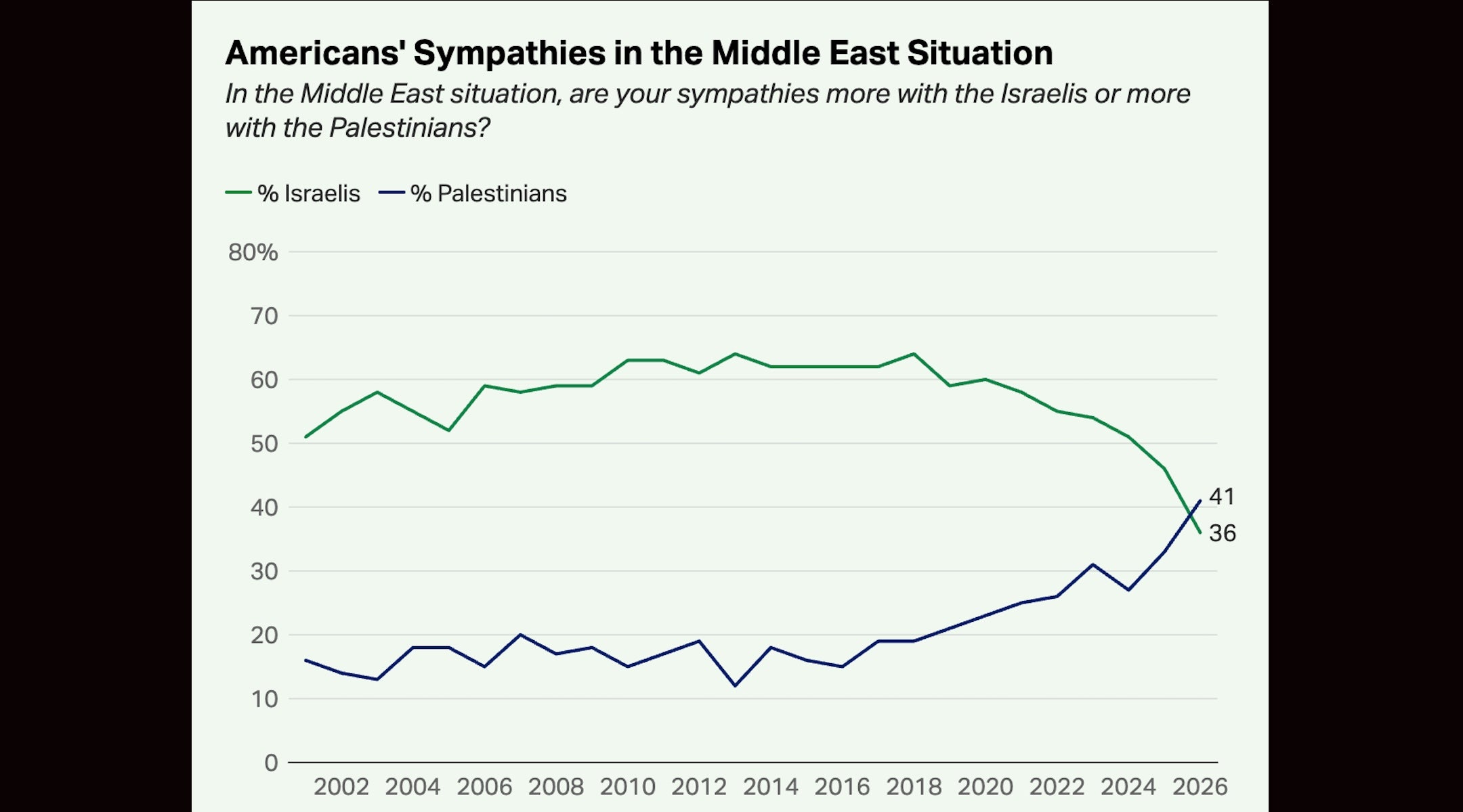 Between 2001 and 2018, the Gallup poll found that Americans were more sympathetic to the Israelis by an average margin of 43 points. The gap began narrowing the following year but did not flip until now.