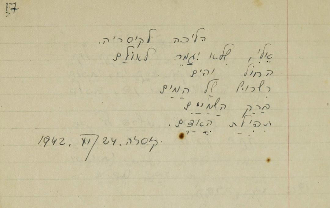 Set to music, Senesh’s short poem (originally titled “A Walk to Caesarea”) reads “My God, may it never end/The sand and the sea,/ plash of the water,/ the crash of the heavens/ the prayer of man. ”