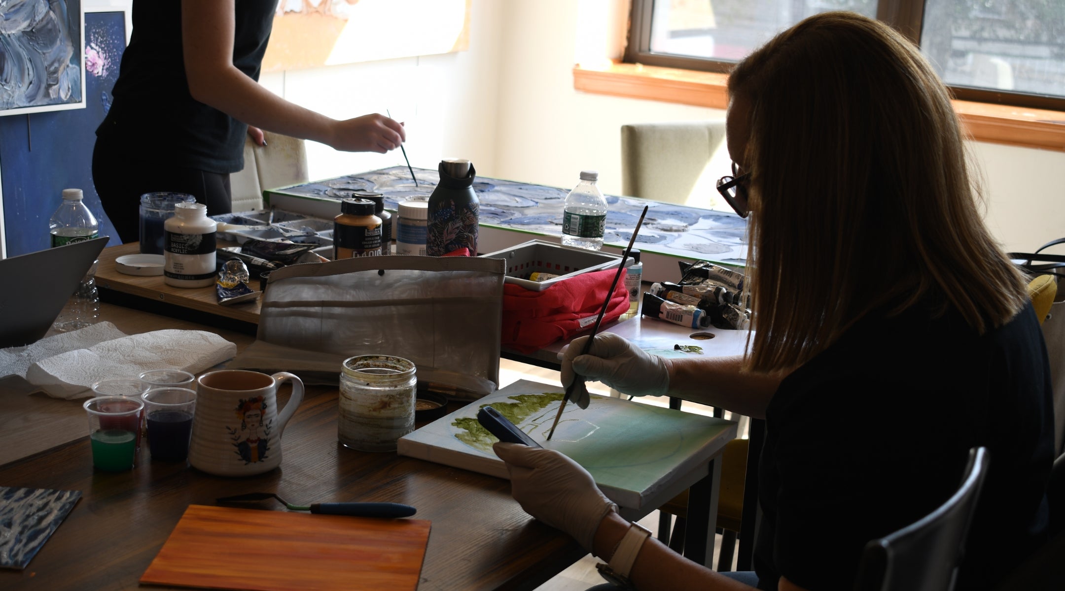 On the second floor of a nondescript commercial building in Gravesend, Brooklyn, is a small artists’ studio. There, four long wooden tables are pushed together to create one massive table covered with oil paints, canvases, watercolors and other tools of the trade. The white walls are adorned with dozens of drawings and paintings; along one wall, a dozen cubbies are filled with even more art supplies.
