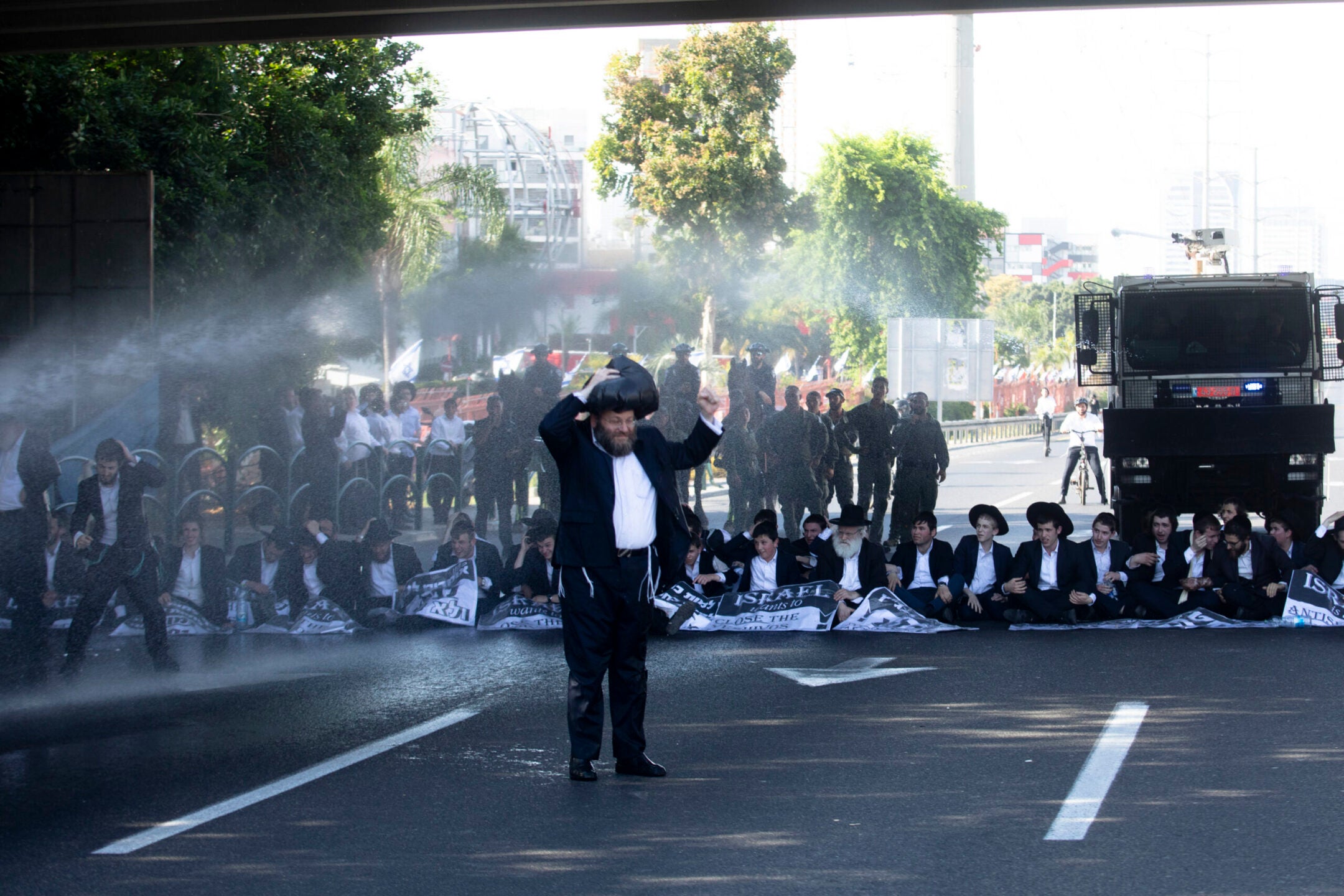 Police officers use water cannons as haredi Orthodox Jewish men block a main highway during a protest against drafting into the Israeli army on June 2, 2024 in Bnei Brak, Israel. (Amir Levy/Getty Images)