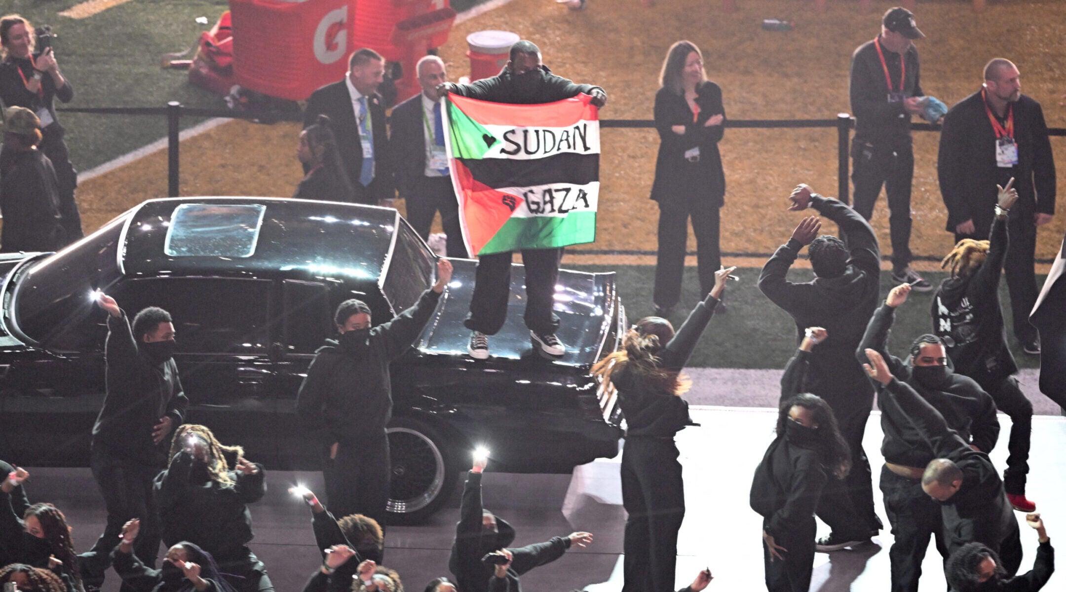 A protester holds a Sudan/Palestinian flag with the words “Gaza” and “Sudan” as US rapper Kendrick Lamar performs during the Super Bowl LIX halftime show, Feb. 9, 2025. (Chandan Khanna/AFP via Getty Images)