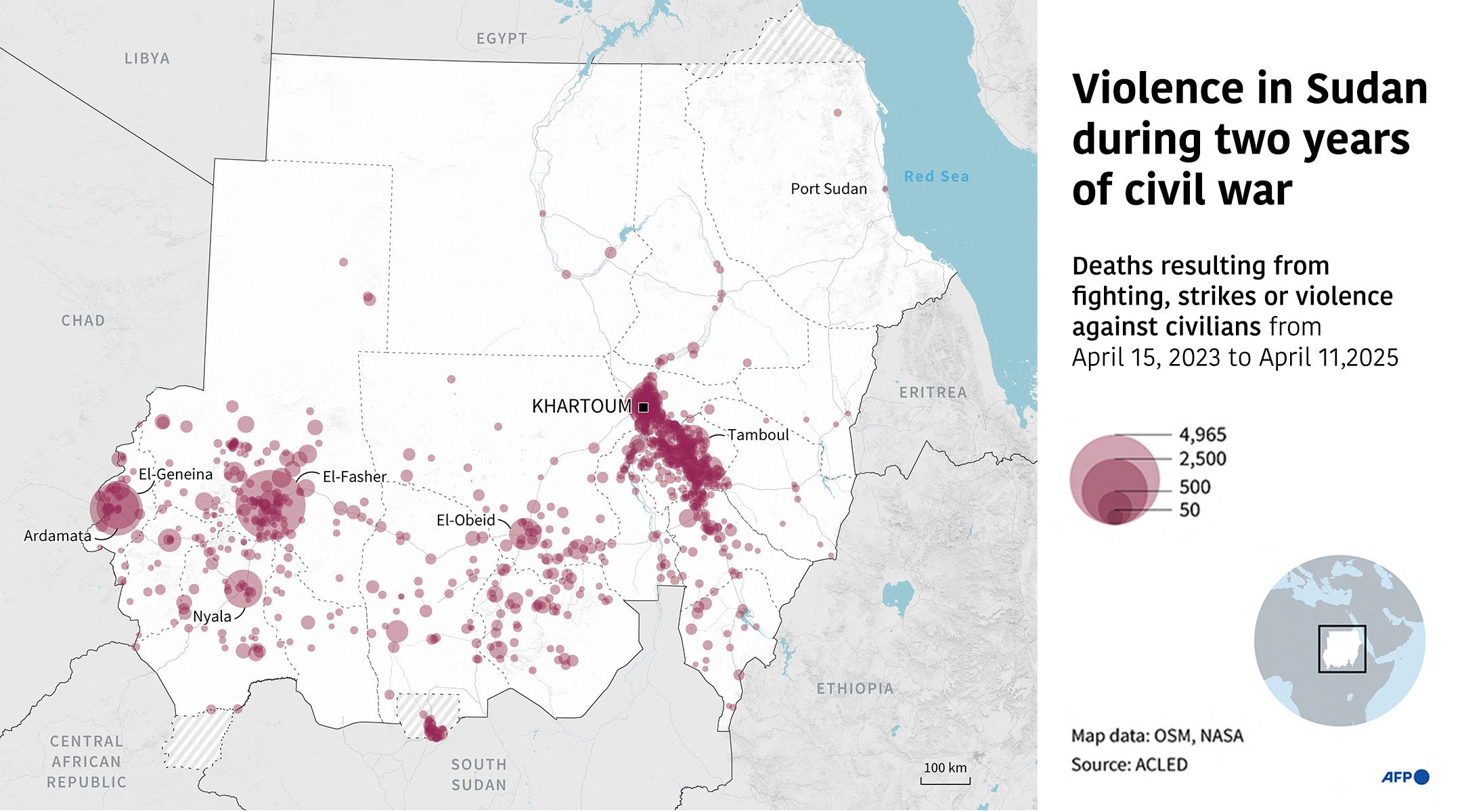 A map of two years of hostilities in Darfur as of April 11, 2025. (AFP via Getty Images)