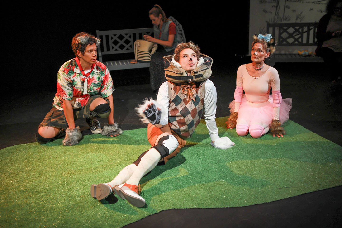 Bringing the dogs’ personalities to light, the boyish Drac (played by actor Peter Pasco) is dressed in a Hawaiian shirt and cargo shorts; the dainty Lucille (portrayed by Janine Venable) looks like a ballerina, complete with a pink tutu and a blue bow in her hair; and the pretentious but talented Zeus is in an argyle sweater-vest. Kudos to costume designer Lisa Lupo.
