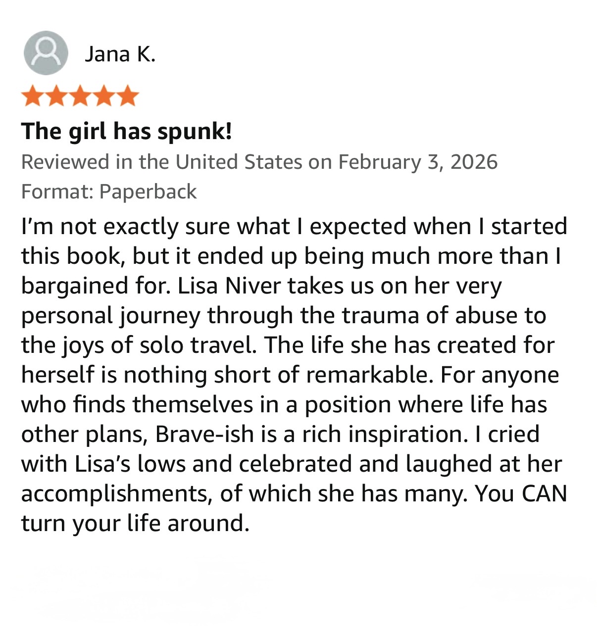 I’m not exactly sure what I expected when I started this book, but it ended up being much more than I bargained for. Lisa Niver takes us on her very personal journey through the trauma of abuse to the joys of solo travel. The life she has created for herself is nothing short of remarkable. For anyone who finds themselves in a position where life has other plans, Brave-ish is a rich inspiration. I cried with Lisa’s lows and celebrated and laughed at her accomplishments, of which she has many. You CAN turn your life around.