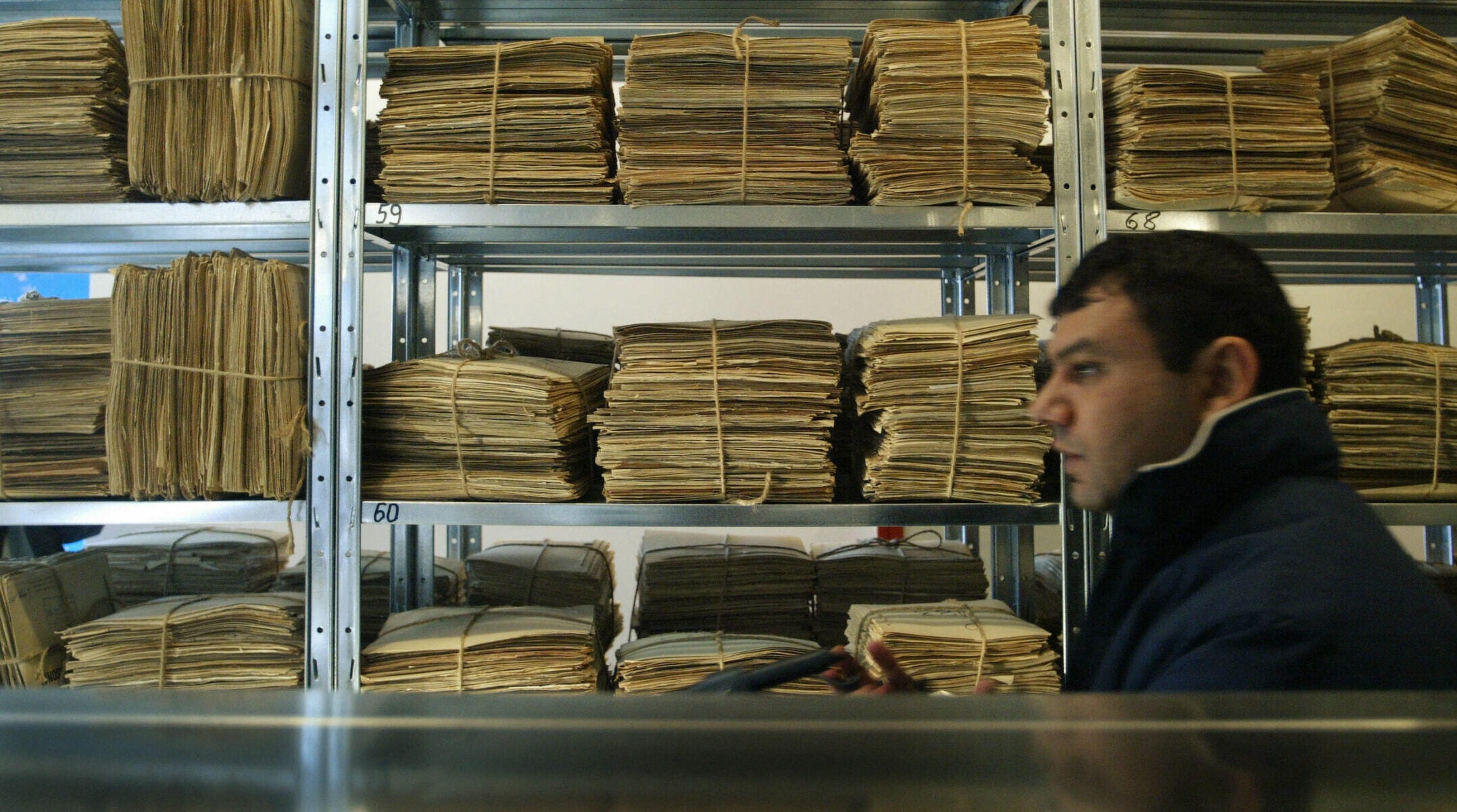 A man walks past shelves of files compiled by Romania’s former Communist regime’s Securitate secret police in Bucharest, March 10 2005. (Daniel Mihailescu/AFP via Getty Images)