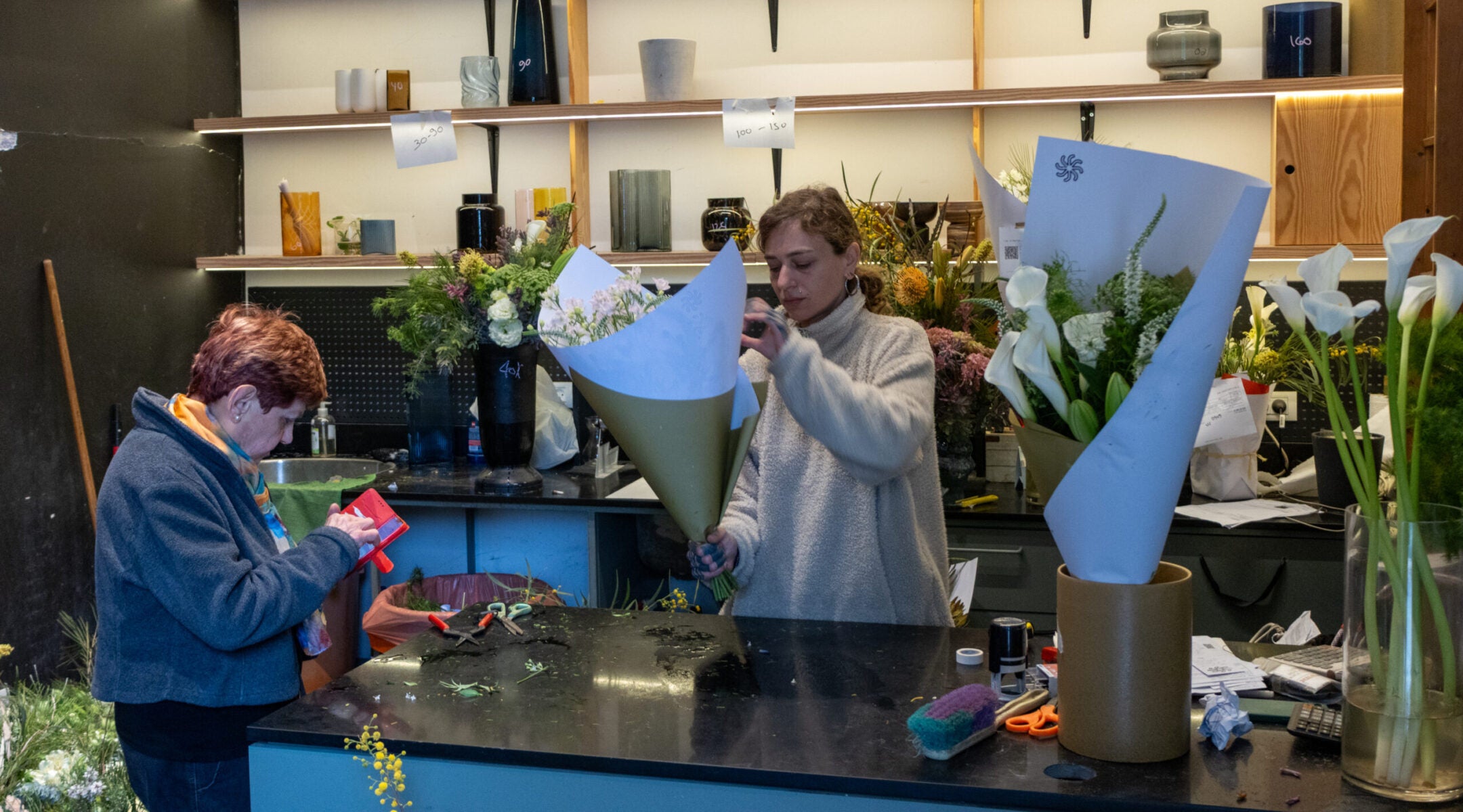 Yael Ben Cnaan helps a customer with a bouquet on the morning before Passover at her store Bishvil Flowers in Tel Aviv, April 1, 2026. (Theia Chatelle)