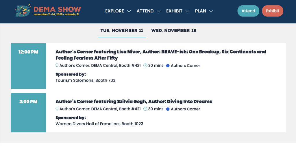 I’m thrilled to be returning to the DEMA Show this year in Orlando to sign my book, BRAVE-ish: One Breakup, Six Continents, and Feeling Fearless After Fifty, in the Author’s Corner. This marks my second time signing at DEMA, after an unforgettable experience in New Orleans in 2023. To come back again, surrounded by this incredible community of divers, ocean advocates, explorers, and storytellers, feels like coming home.