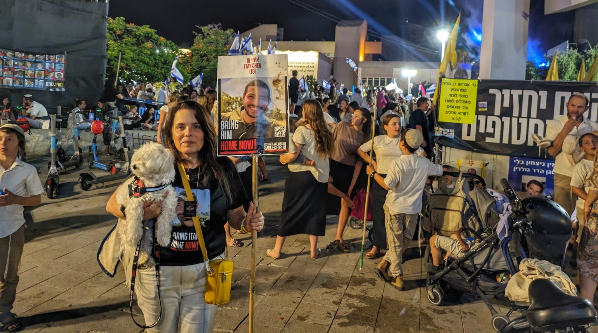 Hagit Chen, the mother of the deceased hostage Itay Chen, poses with his dog in Hostages Square after Simchat Torah in Tel Aviv, Oct. 14, 2025. (Deborah Danan)