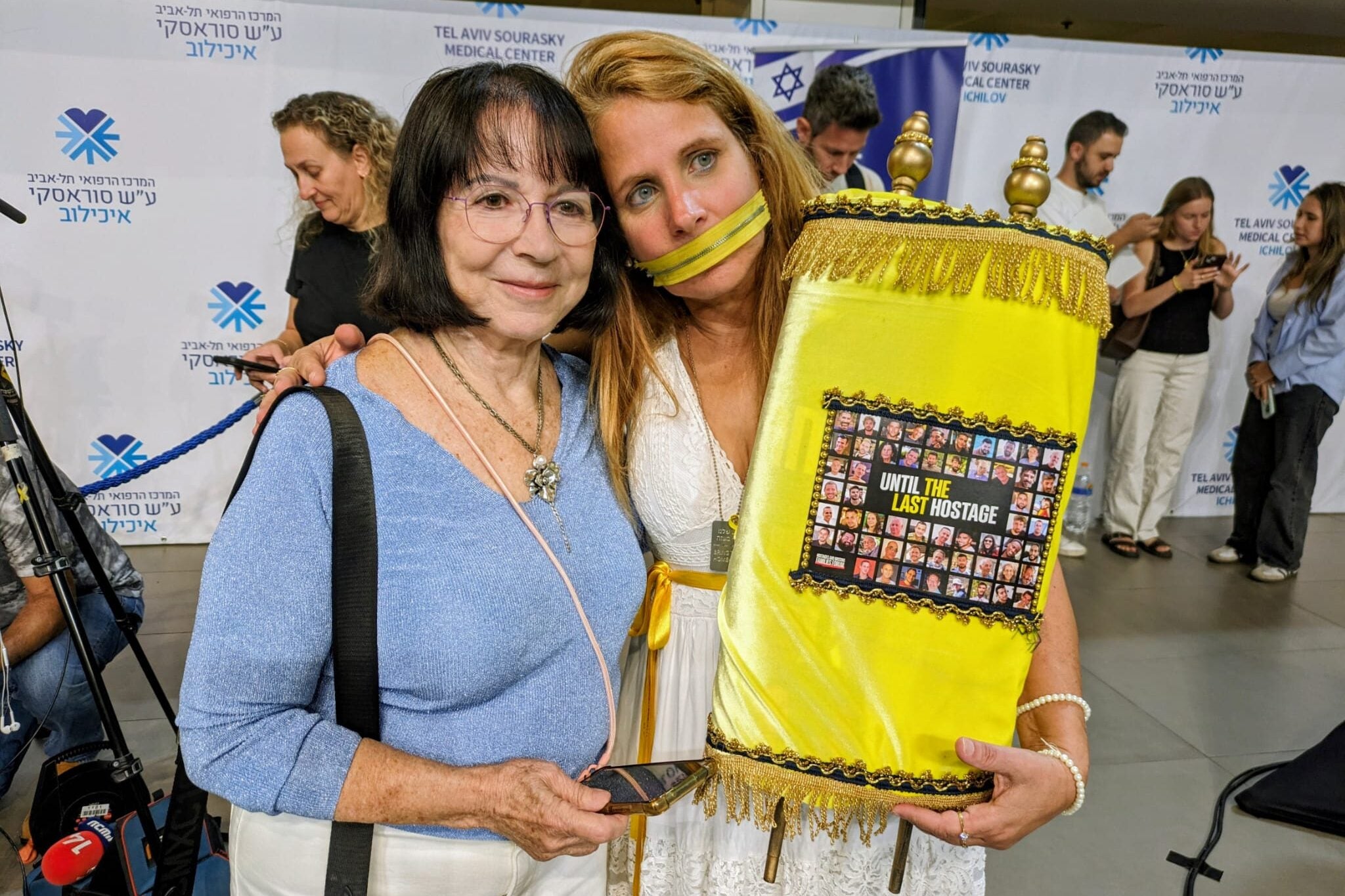 Activist and artist Hila Galilee, posed with Miran’s longtime partner, Galia Korel, while holding a mock yellow Torah scroll with images of the hostages. “The entire Torah is the hostages,” she said.