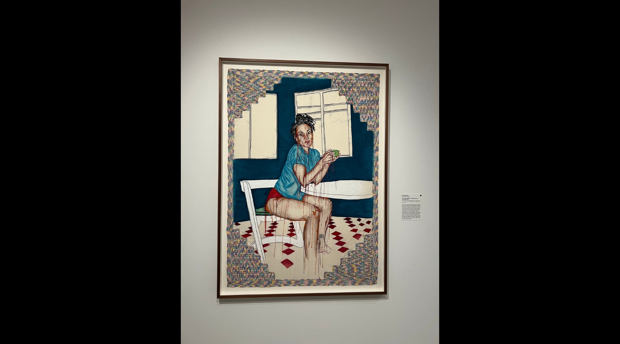 Located on a third-floor gallery, Buckman’s work depicts a woman sitting on a chair; the piece’s name, “in full command of every plan you wrecked,” a reference to a Leonard Cohen lyric from “Alexandra Leaving.” The loose threads — typically found on the back of such woven pieces — subvert expectations of traditional feminine and domestic textile work.