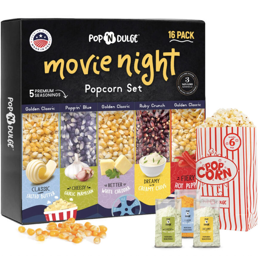 The Pop N’Dulge Movie Night Set ($24.98) contains popcorn everyone will love for movie night, including classic, ruby crunch, and poppin’ blue kernels, along with seasonings like butter, chive, and hot pepper. The set is OU-D Kosher, made in the USA, and beautifully packaged for gifting.