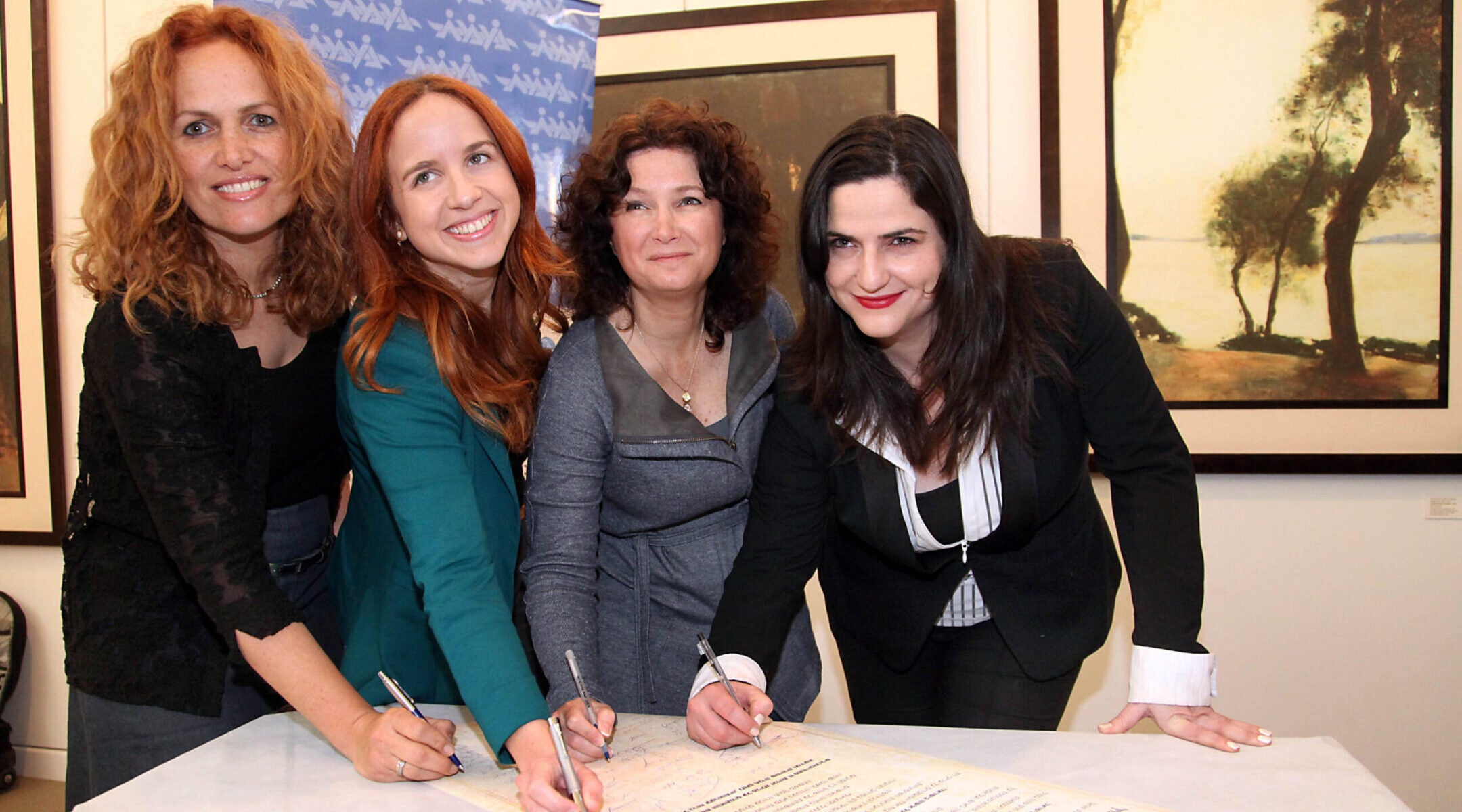 Michal Biran, at right, then a Labor MK, joins colleagues in signing a declaration of women’s rights, on International Women’s Day in Tel Aviv, March 7, 2013. (Gideon Markowicz/Flash90)